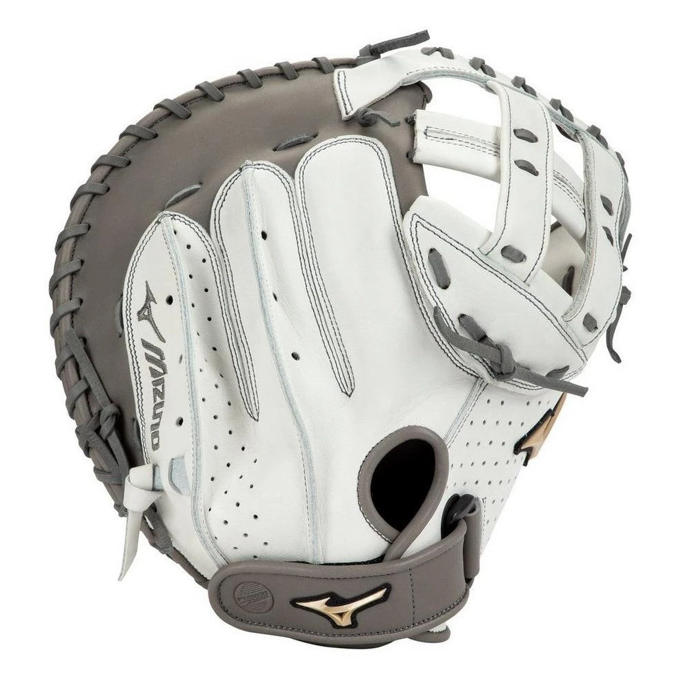 The Mizuno Prime Elite 34 in Fastpitch Catchers Mitt is the perfect fastpitch catcher’s mitt for serious players. When it comes to building the perfect fast pitch softball catcher’s glove Mizuno decided they would try to take the best of both worlds. Some aspects from the past and some from the present. Using soft, smooth white and grey leather the Prime Elite Fastpitch series feels like your favorite gloves of yesteryear with all of the modern attributes that have been developed to help protect and perfect your game. The leather is guaranteed ultra-soft and comes pre-oiled for your convenience in order to reduce break-in time and provide a relaxed, personalized feel that will be retained regardless of use. Power Lock technology installed in the pocket enhances catching ability and stabilizes the key pressure points in the glove responsible for keeping the ball secure while allowing for quick transfers to your throwing hand.